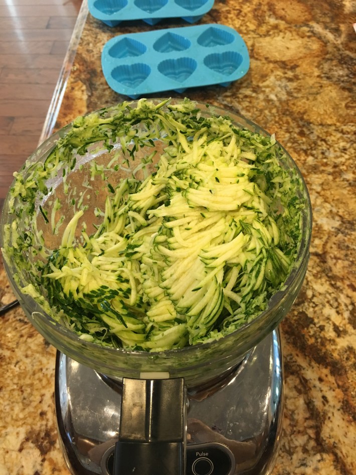 Grate the zucchini. I use the shredder attachment with my food processor because I find it the easiest and fastest method. Place the grated zucchini in a colander with a bowl underneath and mix the salt into it. The salt will help rid the zucchini of excess water. Let it sit for about 20 minutes. Using your hands, squeeze out any excess water.