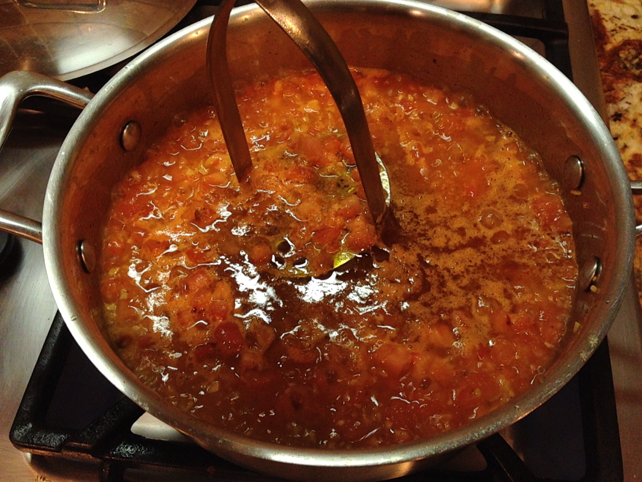 With a masher, crush the tomatoes a little (just press down 5-6 times). Bring to a simmer, cover, and cook for about 5 minutes.