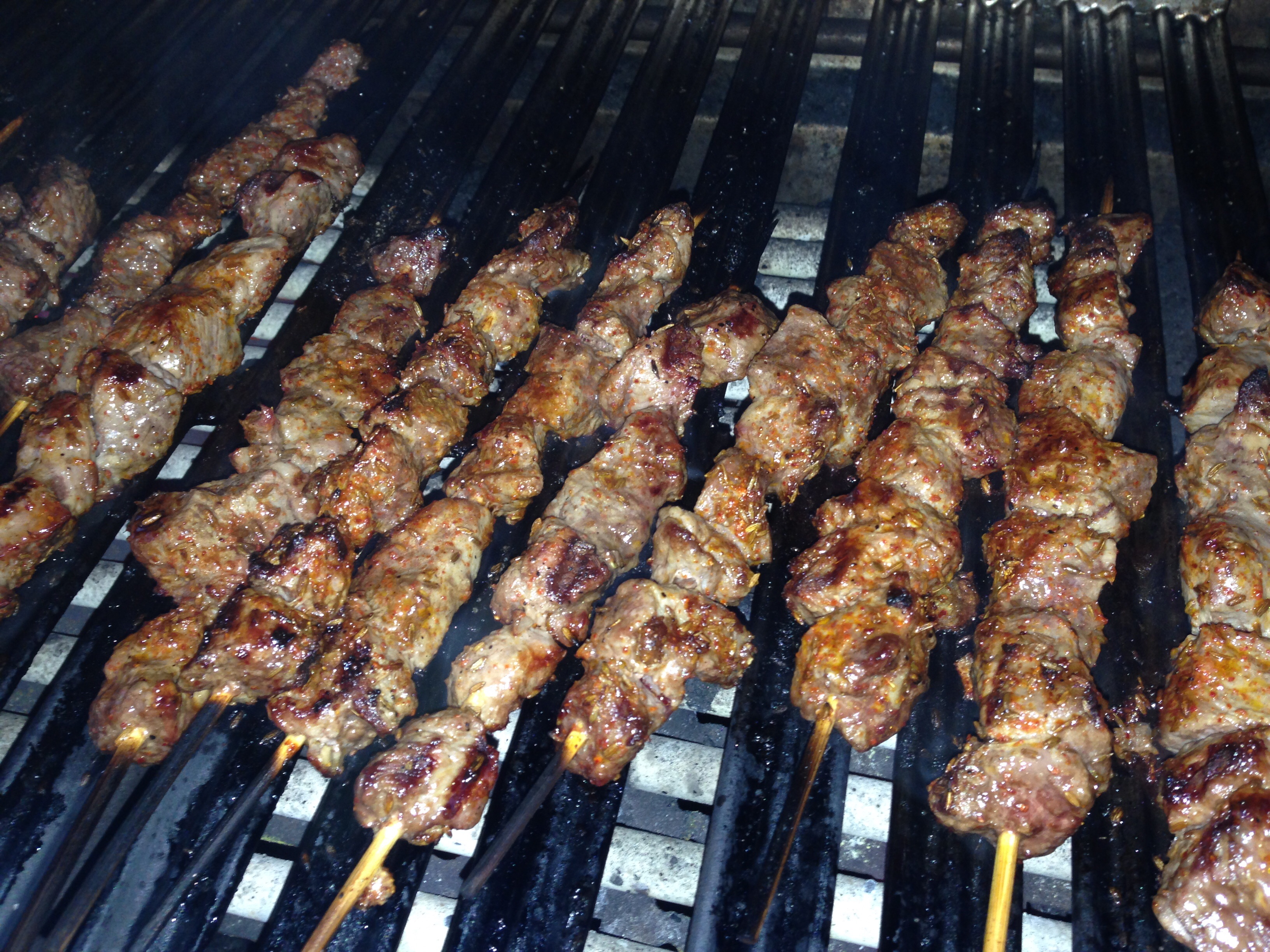 TIme to grill. When the grill is hot, place the kebab skewers on direct heat. Let them cook for about 5 minutes on each side. Use the rest of the spice mixture here. Sprinkle liberally as the kebabs cook. Once cooked through, eat right away.
