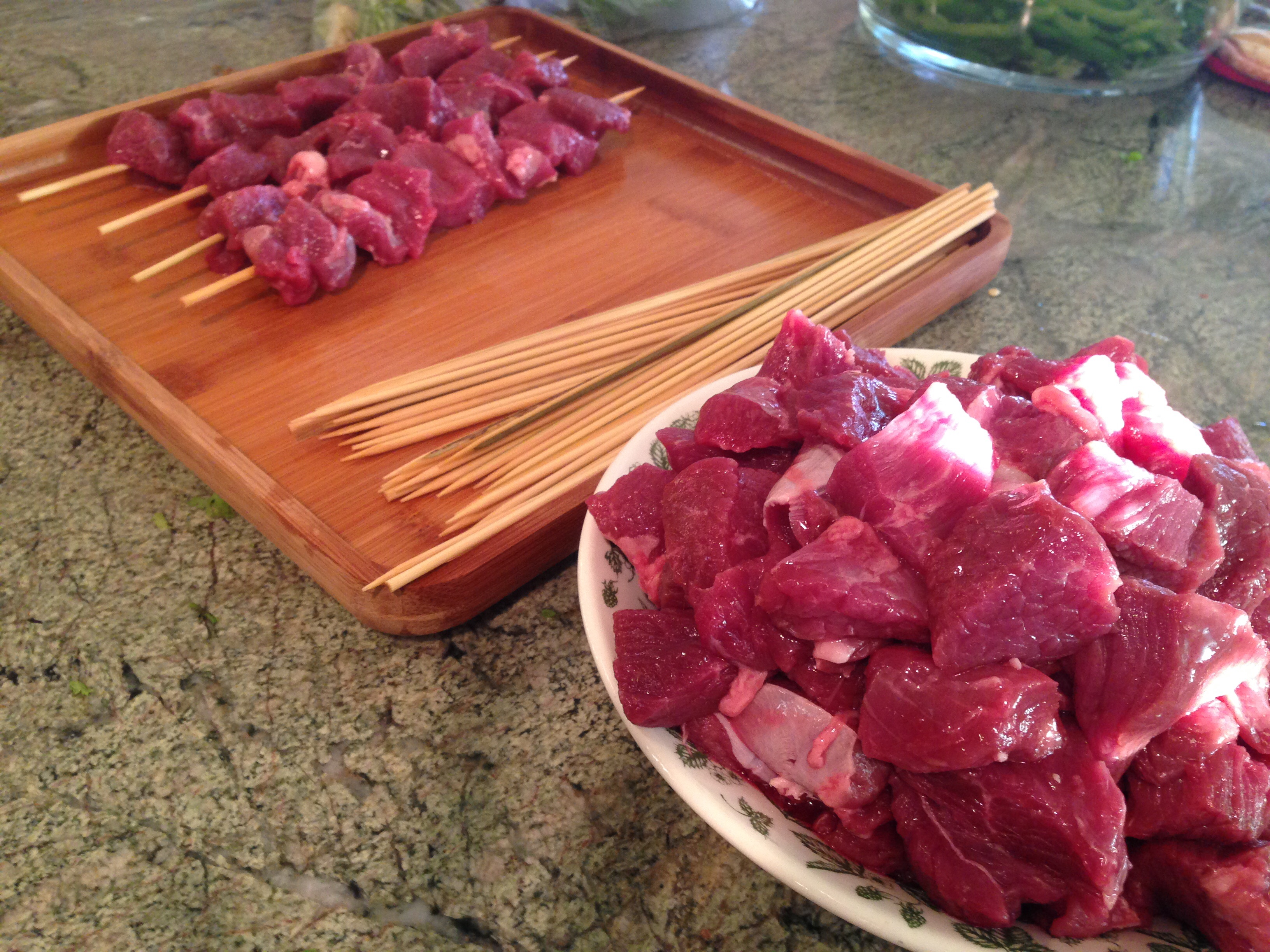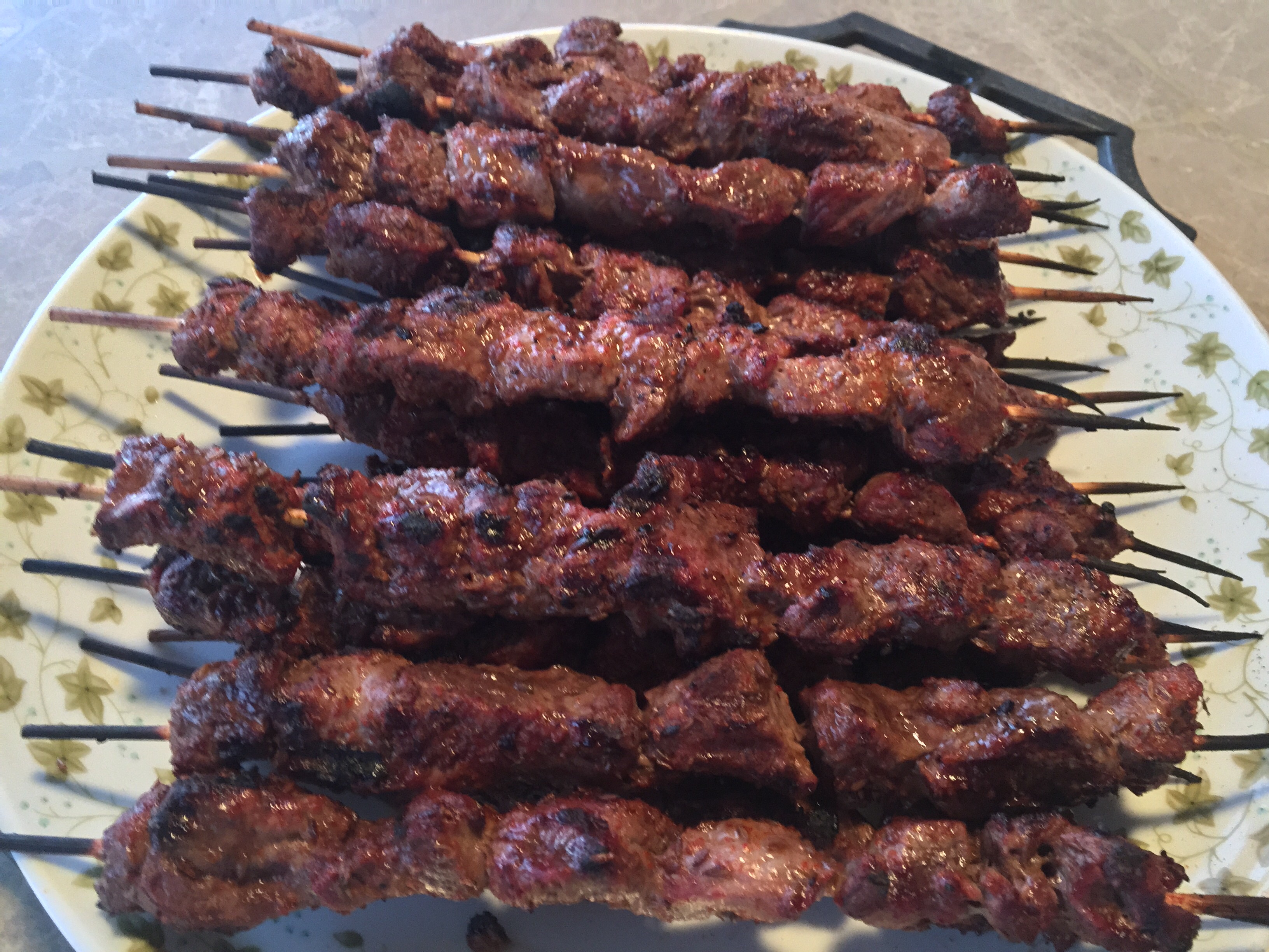 Cut the lamb into 1 inch cubes. The chunks don’t need to be perfectly uniform. Try not to trim the fat off, as it makes the skewers juicier. Start putting the lamb chunks through the skewers. Make sure to not overload the skewers, you will have something to hold on to when your grilling. Brush oil all over the kebabs and sprinkle half of the spice mix all over them. Leave the other half of the spice mix for when you’re grilling. You’ll want to be continuously sprinkling the spices over them like I used to see the street vendors do.