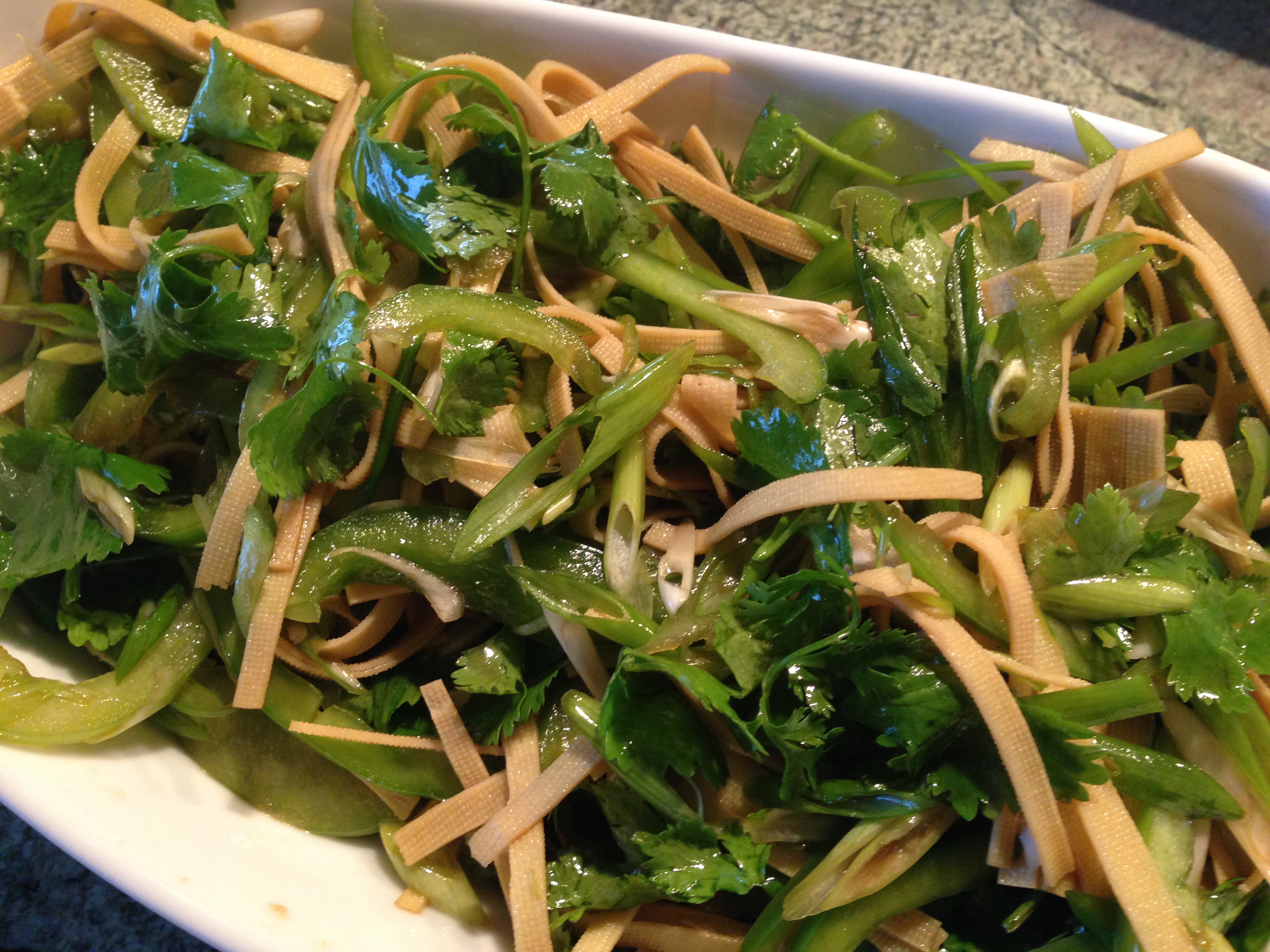 The few summers before I left Beijing in 2007, I had a favorite outdoor restaurant I would go to about once a week. It was very close to my apartment in the Sanlitun area. The place not only made delicious yangrou chuanr, it served a great array of cold dishes and salads. One cold dish in particular was an absolute favorite of mine, called Laohu Cai, or tiger salad. The texture and flavor of this salad just hit the spot for me. The salad contained pressed and shredded tofu sheets, cilantro, green pepper, and green onions. It was both crunchy from the greens and chewy from the tofu, both sour and sweet. I had to learn how to make it.
