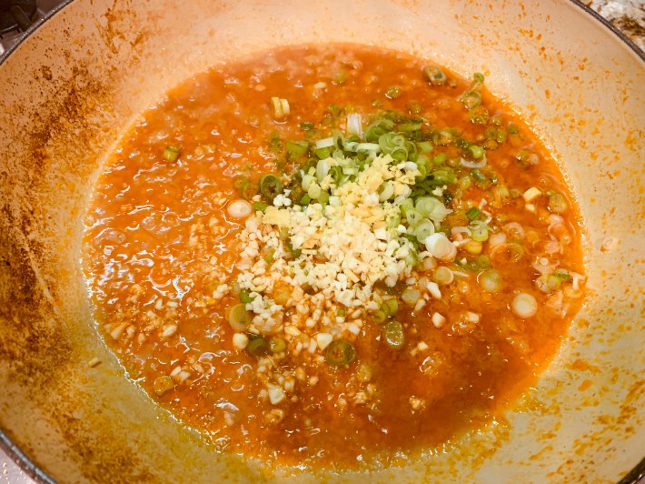 - Lower the heat to medium-high, and add the garlic, ginger and scallions. Stir-fry for about 1 minute, and add the kimchi with its juices, mirin, soy sauce and sugar. Stir-fry for about 5 minutes. Add the pork back in and the onions. Stir-fry for another 2-3 minutes. Taste to know if salt is needed, but the soy sauce should salt the dish adequately.