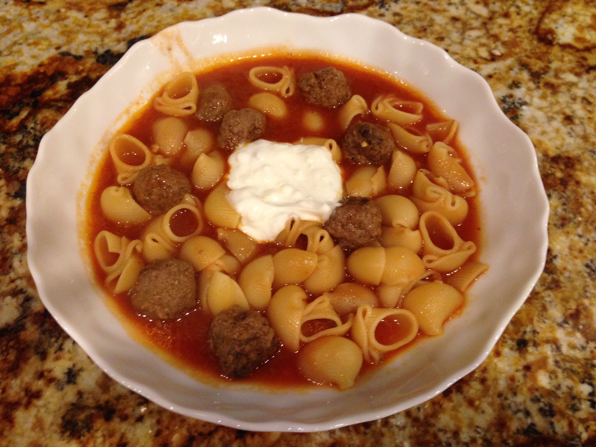 This is a meal I can count on being a winner every time I make it for my family. When I make this, no one complains (not even my youngest one who is three!). My mom used to make this dish growing up. She thought it was a short cut way of making manti, the Turkish/Armenian/Central Asian dumpling dish with ground lamb and yogurt (there are so many versions of that dish). It takes time to make the manti dumplings stuffed with ground lamb, so the shell pasta with meatballs are an easy substitute. This dish has to be served with garlicky Greek yogurt. The mix of the rich tomato with the yogurt sauce is divine! It takes about 30 minutes of hands-on time and 40 minutes of cooking time.