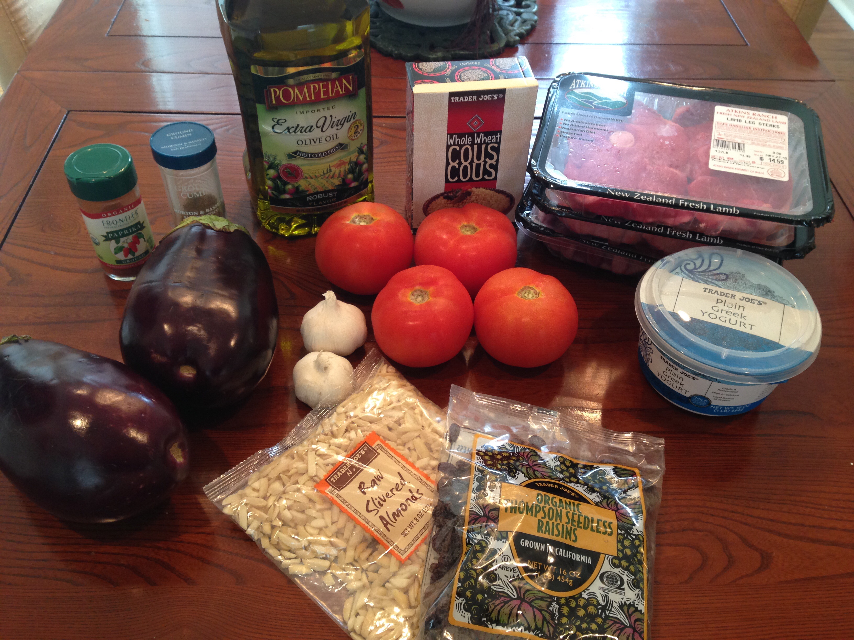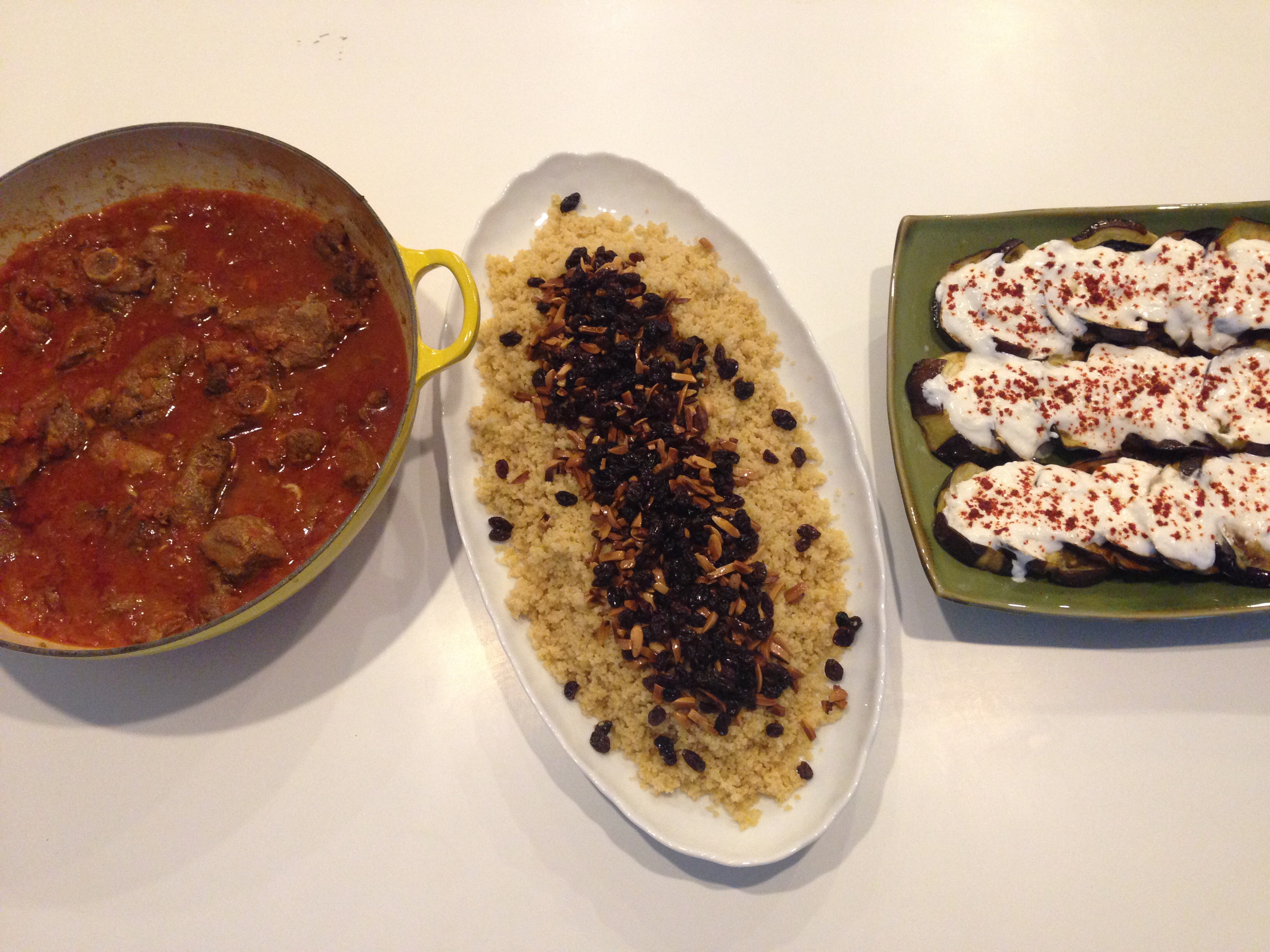 These kebab skewers inspired my paprika and cumin lamb dish. I season the lamb with plenty of paprika and cumin and use fresh chopped tomatoes and garlic as the stew base. I have it all simmer for about 45 minutes, until the lamb is no longer tough. I serve the lamb with couscous sprinkled with nuts and raisins. Roasted eggplant slices with Garlicky yoghurt are also an excellent accompaniment to the lamb. Of course, you wouldn’t be served couscous in Xinjiang, but I like the ease and texture of the couscous with the browned raisins and almond slivers. I really must attempt making a typical Uyghur rice dish called Polo one day. It’s simply delicious and is made with carrots, raisins, mutton, and plenty of mutton fat. I’ve included my lamb stew, couscous and eggplant recipes below. It feeds about 6-8 people.