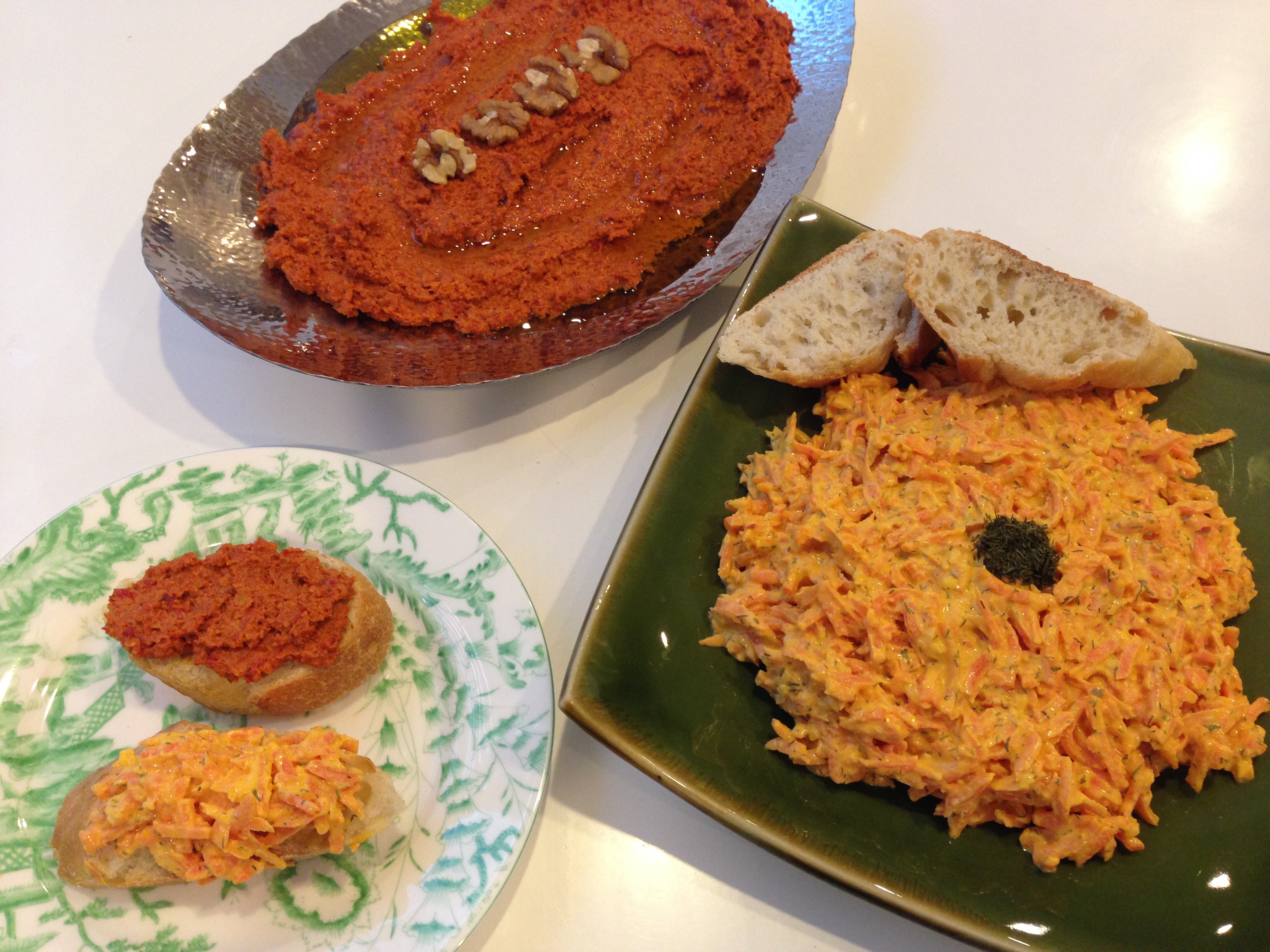 My carrot spread and muhammara are perfect appetizers for when guests come over. Let’s start with the carrot spread. My mother in-law makes this Turkish spread, or a version of it, that instantly took me back to a carrot salad I would often order at my favorite Russian restaurant in Beijing’s Yabaolu area. I would spread it on dark rye bread and greedily eat most of it! I like the flavors because you get sweetness from the carrots and sourness and creaminess from the yogurt and mayonnaise. Garlic completes the dish and is a must. It’s super easy to make and only requires about 10 minutes active time. You will need a food processor to shred the carrots, and that takes the hard work out of it. It can be made the day before guests come over.