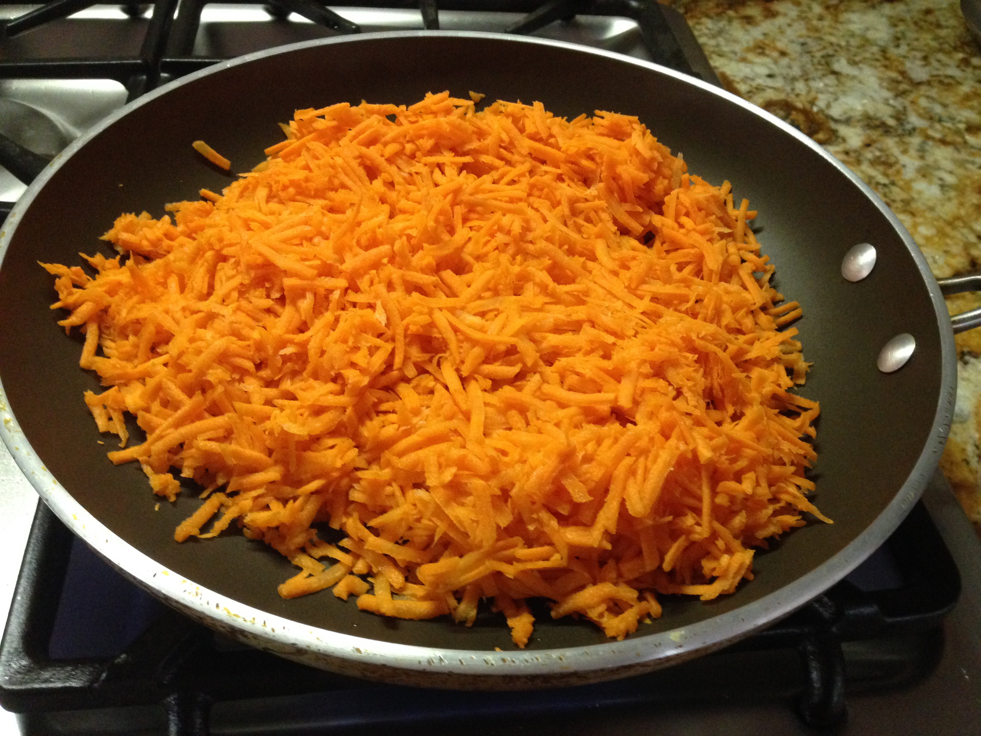 Peel the carrots and shred them using your shredder attachment for food processor. If you don’t have a food processor, you can buy pre-shredded carrots from the supermarket. Add the olive oil to a large frying pan and turn heat to medium-high. Sauté the carrots for about five minutes. They should start to wilt but still be somewhat crunchy.