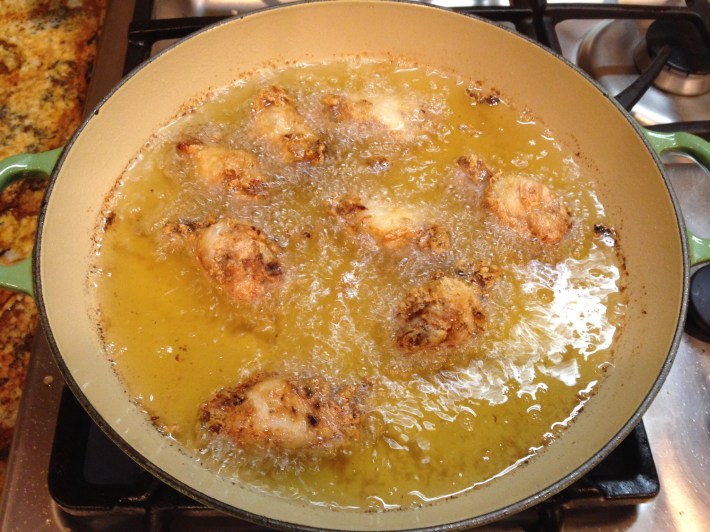 Heat the oil until you see tiny bubbles forming. Add the cornstarch to a shallow bowl. Dust the chicken wings into the cornstarch, shake the excess off, and place in the skillet. Fry on each side for about 3-5 minutes. Watch the coloring. It should be golden.